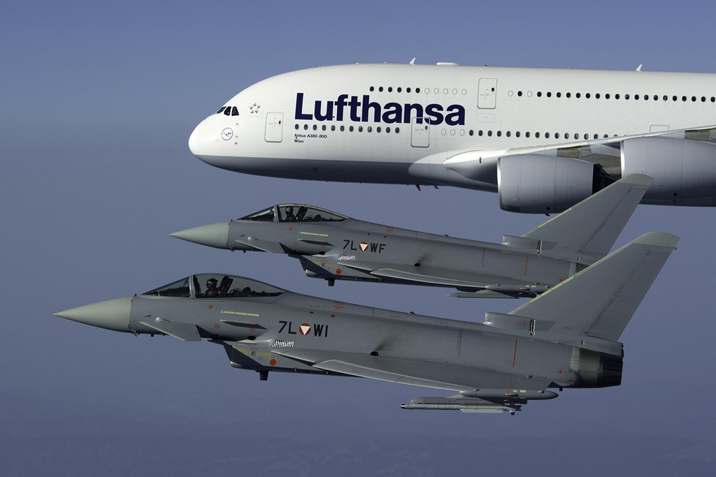 Dos Eurofighter de Austria volaron en formación con el Airbus A380 mas nuevo de Lufthansa