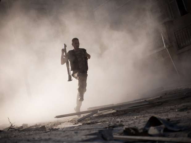 Un miembro de la milicia siria corre tras atacar un tanque gubernamental con un lanzagranadas en el distrito de Alepo